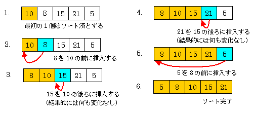 基本挿入法は、まだソートしていない1個のデータを既にソートしてあるデータ列の 適切な場所に挿入する方法である。下図のようにソート済の範囲(オレンジ色)が徐々に増えていき、最終的に全てがソートされる。
