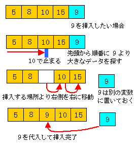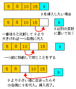 実は前からでなく後ろから比較していくと、もっと高速になる。 下図のように、後ろから比較していき、 挿入したいデータより小さな値に会うまでデータを1つ右に移動していけば良い。 上記の処理では配列の全てのデータにアクセスする必要があったが、この方法なら 挿入すべき場所の右側だけアクセスすれば良いので、高速になる。