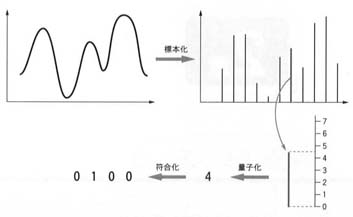 された信号の振幅の大きさを数値化することをいう.符号化は,量子化された振幅をコンピュータが理解できる2進数で表す作業をいう.