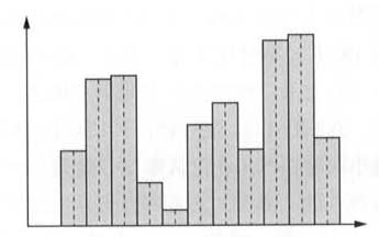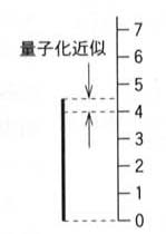 PCMにおける標本化では,ある時点ごとに振幅を抽出するが,これは連続信号を図2に示すような階段状の図形に近似していることになる.したがって,1秒間に行う標本化の数,すなわち標本化周波数(サンプルレート)を増やすことによって近似精度が上がる.また,量子化では,想定している最大振幅をある決められたステップ数に分割し,アナログ信号の振幅を,そのステップ幅を単位とした整数値で近似している.例えば図3では8ステップ(3ビット)に分割したスケールを用いているが,アナログ信号の振幅が4と5の間の値であるにもかかわらず,量子化の値は4となる.そこで,量子化の精度を上げるためには,全体を分割するステップ数(ビットレート)を増やす必要がある.
