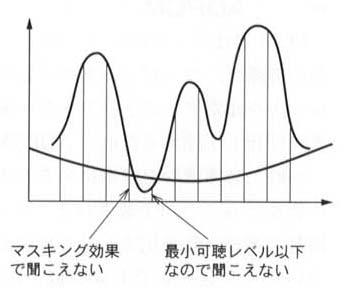 人間が音声を聞く場合,ある程度大きな音でないと聞こえない周波数領域がある.これを最小可聴レベルと呼ぶ.また,ある強い音が存在すると,その周辺の弱い音は聞こえないという心理聴覚特性をマスキング効果と呼ぶ.
