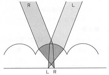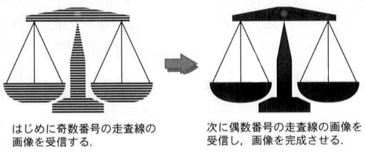 ●インタレース走査 一つの画面を走査するには,ある程度の時間がかかる.走査時間は1/100秒単位のごく短い時間であるが,画面のちらつきの原因となる.そこで,実際に使用されている放送方式では,インタレース走査という方式を採用して,ちらつきを最小限におさえる努力がなされている.インタレース走査とは,通常の走査が画面の左上から右下に向かって順次走査するのに対して,走査位置をいくつか飛び越しながら行う走査である.たとえば,2:1インタレースの飛び越し走査では,一つの画面を奇数番めの走査線からなる粗い画像信号と,偶数番めの走査線からなる粗い画像信号に分けて送受信する.