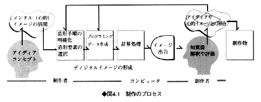 制作においては、形態のもつ意味や、心的な効果も考慮しながら画像の評価を行うのであり、モニタ上に画像を描くことがすべてではない。アイディアを具体化する際のイメージの構造化、表示法、および見る側の反応などといった要素も検討しなければならないのである(図4.1)。