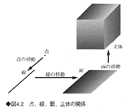 幾何学的には、点は面積をもたず、位置のみを示す。この点が移動した軌跡が線である。さらに線の移動によって面が形成され、面を移動させることで立体を作ることができる(図4.2)。