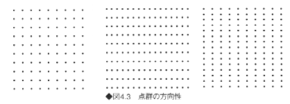 等間隔に置かれた点は正方形のパターンに見えるが、点を置く間隔を変化させることによって方向を示すことができる(図4.3)。