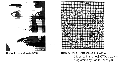 複数の点や線の大きさを変化させることで、量の大小が表される。図4.4に示した人の顔の図は、点の大きさで濃度(濃さの大小)を表している。また格子の移動量に対応させると、線の交差したネットの中に形がイメージされる(図4.5)。