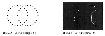 点を連続させることで輪郭を示すことができる。円状に配置された点群は、それぞれが連結し2つの線の交わりのように見える(図4.6)。また北斗七星は、点として見える星の間に線があるものとして見ていることを示す例である(図4,7)。