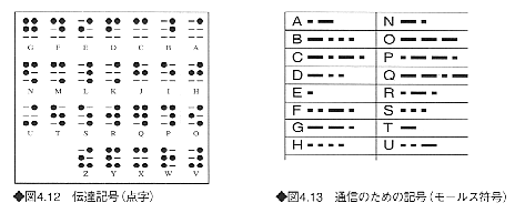 点や線の組合せで特定の記号を表す。点字は縦3行横2列の凸状の点の組合せからなる64の符号を基本とし、これによりアルファベット、数字など各種の記号が作られている(図4.12)。また、モールス符号は長符(線)と短符(点)の組合せによってこれらを表している(図4.13)。