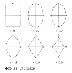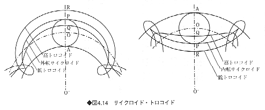 円に接しながら転がる別の円(転円)の円周上の点Pの軌跡は、サイクロイドとよばれる。また、点Pが円周上ではなく半径上にあるときは低トロコイド、半径の延長上にあるときは高トロコイドとよばれ、サイクロイドとは異なった曲線となる(図4.14)。さらに、円(導円という)の外側を転円が転がる場合(外転)と、内側を転がる場合(内転)との区別も考えられる。