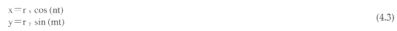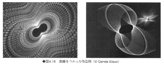 のようにして、m、nにさまざまな値を与えると、いろいろなリサージュ曲線が描ける(2-4-3参照)。リサージュ曲線などを利用した作品例を図4.15、図4.16に示す。