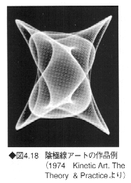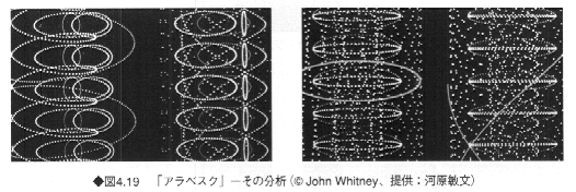 コンピュータアートの父ともいわれるホイットニー(John Whitney)は、1968年の「アラベスク(Arabesuque)」や「パーミュテーション(Permutation)」といった作品のなかで、点群によって構成されたリサージュパターンの周期を変化させ、右へ左へ、上へ下へとパターンを動かし、反復と収束の感覚を与える映像を制作している(図4.19)。