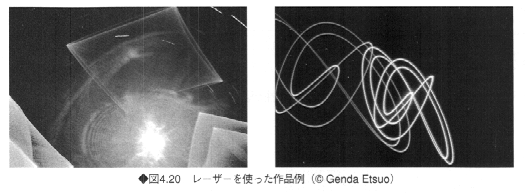1973年に、ドライヤー(Ivan Dryer)は波形合成によって作られた信号によって、XY方向に直交して設置された2つのスキャナミラーを走査し、レーザー光をミラーに当ててレーザーパターンを作り出した。これは、ロサンゼルスのグリフィス天文台プラネタリウムのドームに、クリプトンレーザーによる赤、黄、緑、青の幾何学パターンを音楽とともに投影して幻想的な宇宙空間的イメージを演出したもので、このショーは「LASERIUM」と名付けられ、全米各地をはじめ日本、ヨーロッパなどでも公演された(図4.20)。