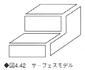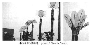 曲面は、代数曲面と自由曲面に大別できる。代数曲面はx、y、zの3変数の多項式で表現でき、球、円柱、円錐などは2次曲面として表されるが、さらに複雑な自由曲面の形状を表すためには曲面パッチが用いられる。曲面パッチを構成する長方形領域を(u,v)平面とみなし、S(u,v)のパラメータ形式で表現するパラメトリック曲面で複雑な形状の立体を表す。図4.22は2次曲面を利用した横浜博における造形の例で、金網で曲面を形成させている。