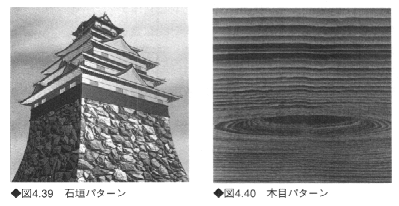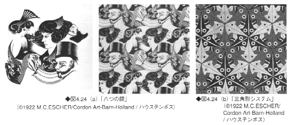 これらの平面充填パターンは、鏡映や回転などとも複合して構成される。こうしてできた平面充填パターンは、図形生成の手続きとして行った方法が、そのまま図形を見るときの見え方とは必ずしもならない。見る側においては、隣接したパターンとの図形的な結合や視覚的な連続性によって、生成ルールの段階では予測できないような形として認識されることもある(図4.24)。