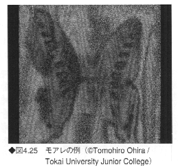 ほぼ同じ周期的構造をもったパターンが重なり合ったときに生じる別のパターンをモアレという。平行線のパターンや、点が等間隔に並んだパターンを使い、原パターンの上に同一のパターンをわずかに角度をずらして重ね合わせると、新たな二次的パターンが発生する(図4.25)。重ね合わせる2つのパターンは同一のパターンでなくてもよく、周期的な構造が類似していればモアレが生成される。