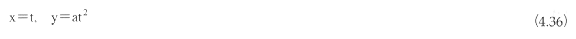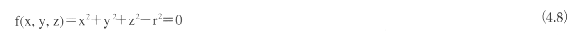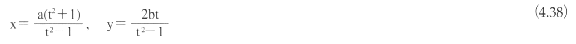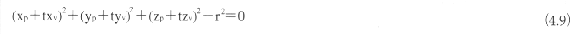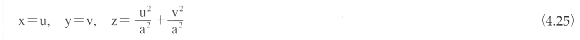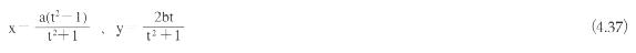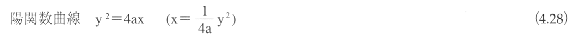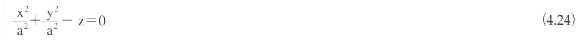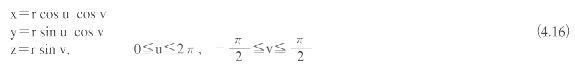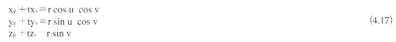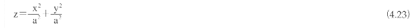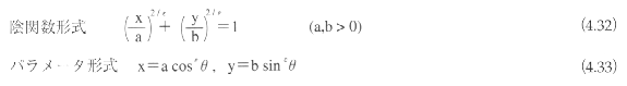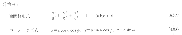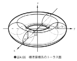 トーラス面は2次曲面ではないが、2次曲面を拡張したものと考えられる。トーラス面も、平面上の平行移動と回転によって、図4.66に示す標準座標系に変換できる。標準座標系におけるトーラス面の表現式は以下のようになる。