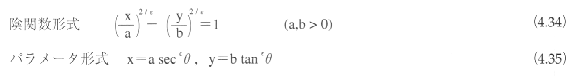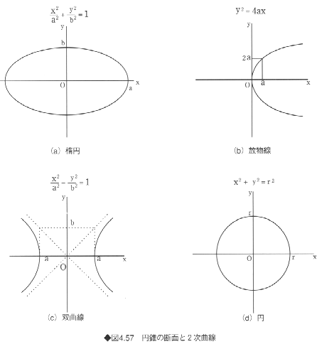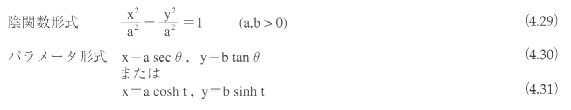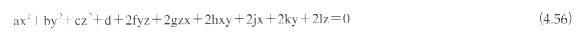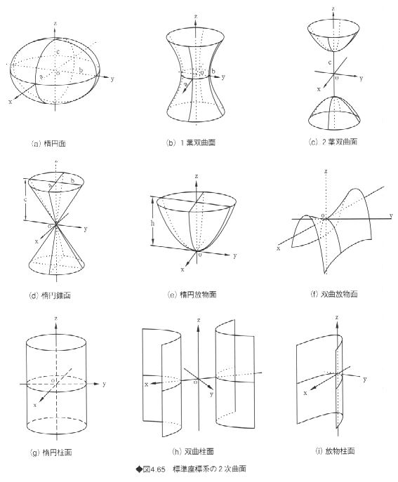 2次曲面は、平面上の平行移動と回転によって、図4.65に示す標準座標系に変換できる。標準座標系における2次曲面の表現式は以下のようになる。