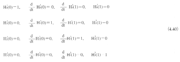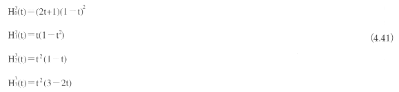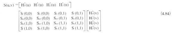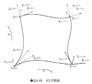 双3次曲面は、図4.68のように四辺形パッチの四隅の点とそこでの接ベクトルとツイストベクトルによって定義される3次の多項式曲面である。双3次曲面の定義されるパラメータ領域はu∈[0,1]、v∈[0,1]である。双3次曲面は3次エルミート関数を用いて、次のように表現される。