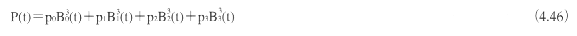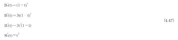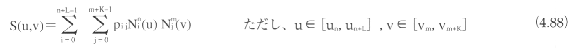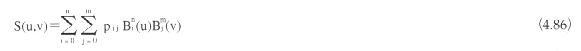 ここで、Bni(u)、Bmj(v)は、それぞれn次とm次のバーンスタイン関数である。したがって、式(4.83)を見ると、ベジェ曲面上の点S(u,v)は、制御点pijの荷重平均になっており、パラメータu、vが変化すると、各制御点に対する重みBni(u)Bmj(v)が連続的に変化して、点S(u,v)が連続的に移動する。この点の軌跡がベジェ曲面となる。