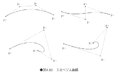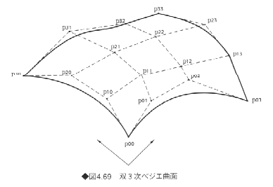 CGでは次数が3次までのベジェ曲面がよく用いられる。双3次ベジェ曲面は、図4,69に示すよう