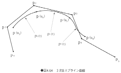 ここで式(4.51)を式(4.42)と見比べると、Bスプライン曲線もベジェ曲線のように、点piの荷重平均の形式になっている。つまり、n次のBスプライン曲線の各セグメントは、通常(n+1)個の制御点によって定められる。この性質をBスプライン曲線の局所性とよぶ。また隣同士のセグメントはn個の制御点を共有しており、Bスプライン関数の性質から曲線もCn-1級の連続性を保証する。このほか、Bスプライン曲線には、ベジェ曲線と同様に、凸包性、変動減少性、直線再現性、アフィン不変性などの性質がある。図4.64に一様ノットの場合の3次Bスプライン曲線の例を示す。