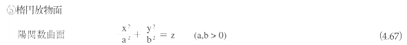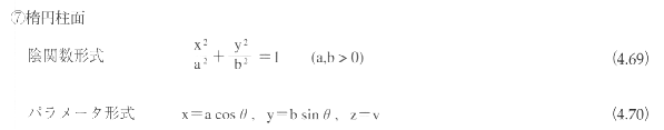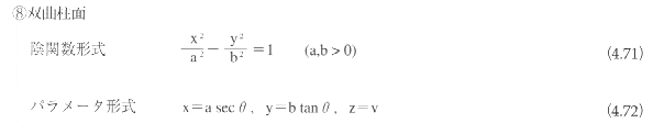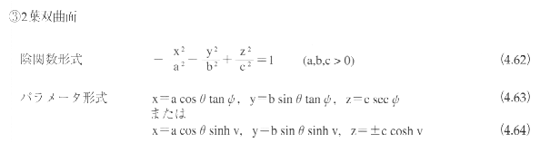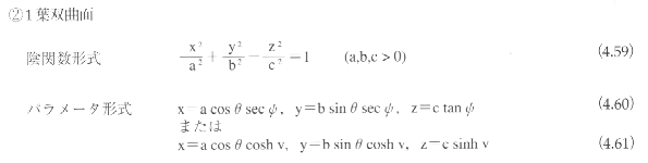paraboloid)、双曲放物面(hyperbolic paraboloid)、楕円柱面(elliptic cylinder)、双曲柱面(hyperbolic