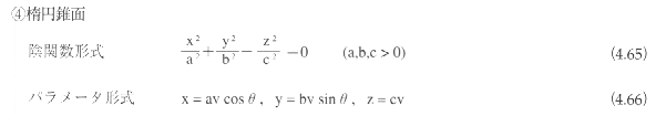 of one sheet)、2葉双曲面(hyperboloid of two sheets)、楕円錐面(elliptic cone)、楕円放物面(elliptic