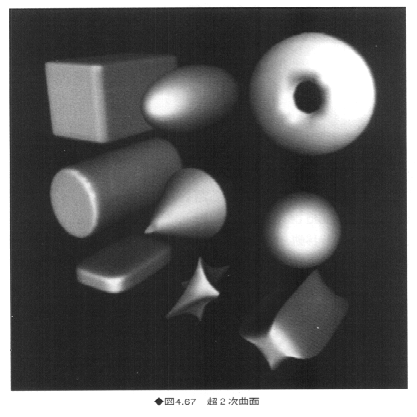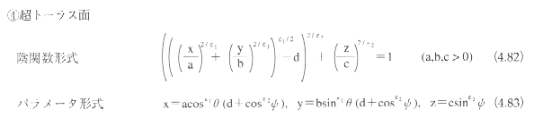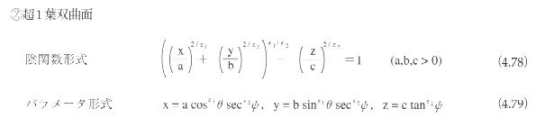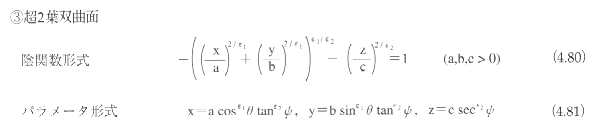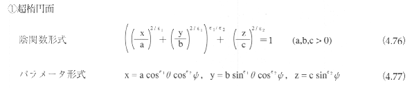 超2次曲面(superquadrics)17)は、2次曲面を拡張して、丸みを制御できるようにしたものである。超2次曲面には、超楕円面(superellipsoid)、超1葉双曲面(superhyperboloid