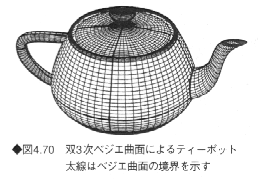 CGの分野で、新しいレンダリングアルゴリズムを提案したり、アルゴリズムの速度を比較したりするとき、標準の物体としてしばしば使われたことで有名なティーポットは約40枚の双3次ベジェ曲面を接続した曲面として定義されている(図4.70)。
