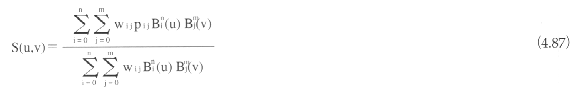 ここでNni(u)、Nmj(v)は、それぞれn次とm次のBスプライン関数である。NURBS曲面は有理ベジェ曲面とBスプライン曲面の性質をあわせもつ。