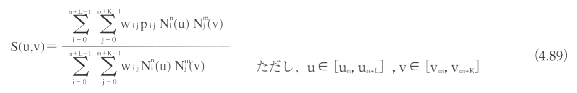 ここでNni(u)、Nmj(v)は、それぞれn次とm次のBスプライン関数である。なお、n=mのときにはベジェ曲面同様に、双n次のBスプライン曲面とよぶこともある。