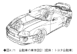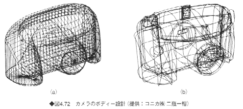 Bスプライン曲面やNURBS曲面は、自動車、航空機、家庭電器製品、カメラ、容器など、さまざまな工業製品の設計に広く使われている。図4.71に自動車の例を、図4.72にカメラの例を示す。